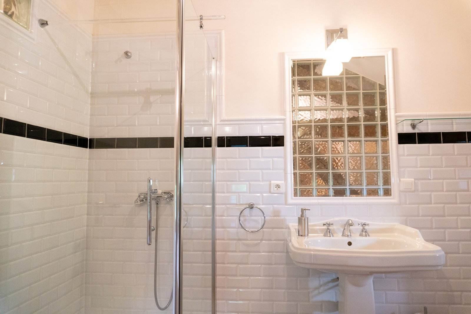 Blue Bedroom – Ground Floor – Bedroom nr. 2: en-suite bathroom, double bed 180x200cm. The bathroom has an antique bath, separate shower, wash basin, and separate toilet in the tower.